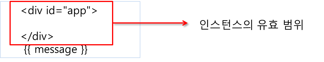 현재 코드에서 인스턴스의 유효 범위는 el속성으로 지정한 <div id="app"> 태그 아래에 오는 요소들로 제한됩니다. 따라서 <div> 태그 바깥에 있는 {{ message }}는 뷰에서 인식하지 못 하기 때문에 Hello Vue.js!로 바뀌지 않고 {{ message }} 그대로 출력이 됩니다.