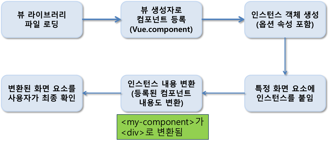 이 코드가 실행되어 화면에 나타나기까지의 과정을 살펴보면 다음과 같습니다. 앞에서 살펴본 인스턴스가 화면에 적용되는 과정의 그림에 컴포넌트 등록 부분과 변환 부분을 추가하였습니다.