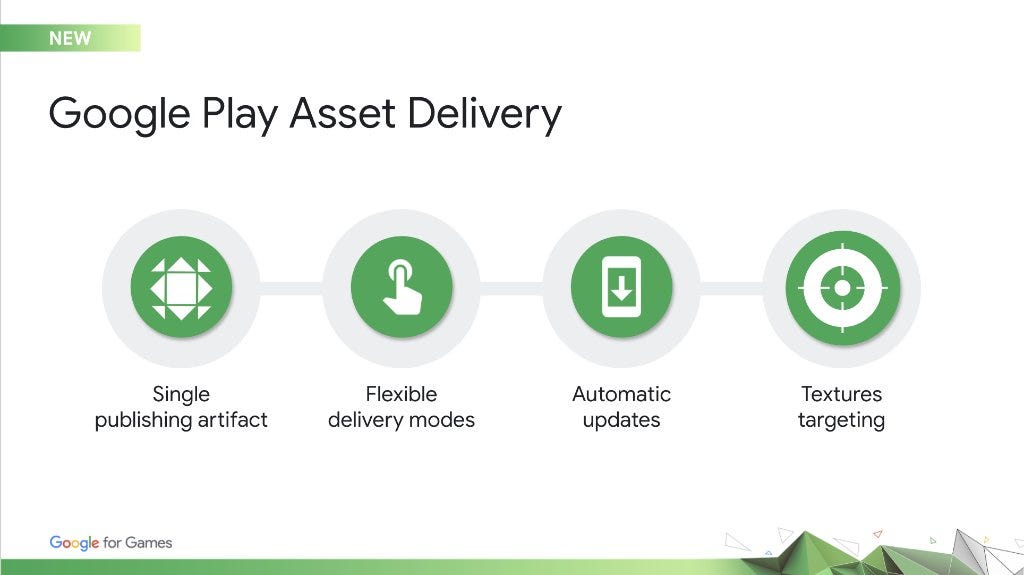 ① Play Asset Delivery: 에셋 팩은 앱 업데이트와 별개로 업데이트할 수 있으며, 구글 플레이는 변경된 에셋만 전송