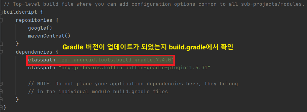 ① Android Studio 수동 업데이트: build.gradle 파일을 직접 수정하여 AGP를 업그레이드할 때 Gradle 버전을 함께 업데이트하지 않은 경우