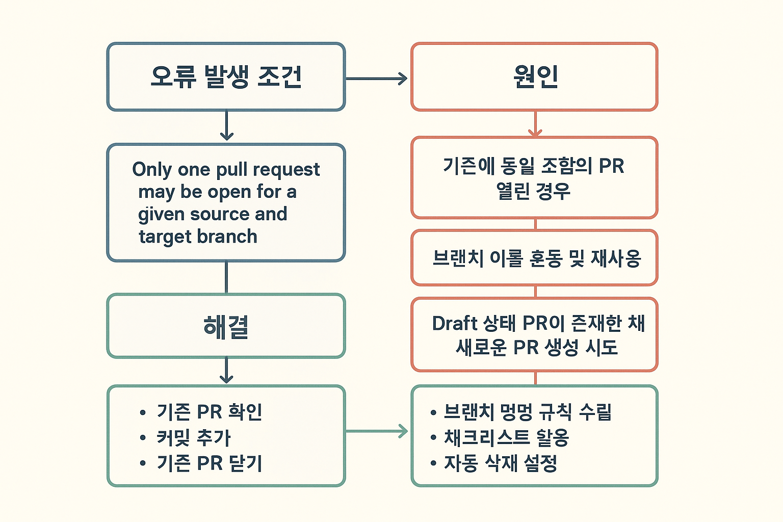 | 이전 PR 미처리 | 같은 브랜치로 생성한 이전 PR이 아직 열려 있는 경우 |